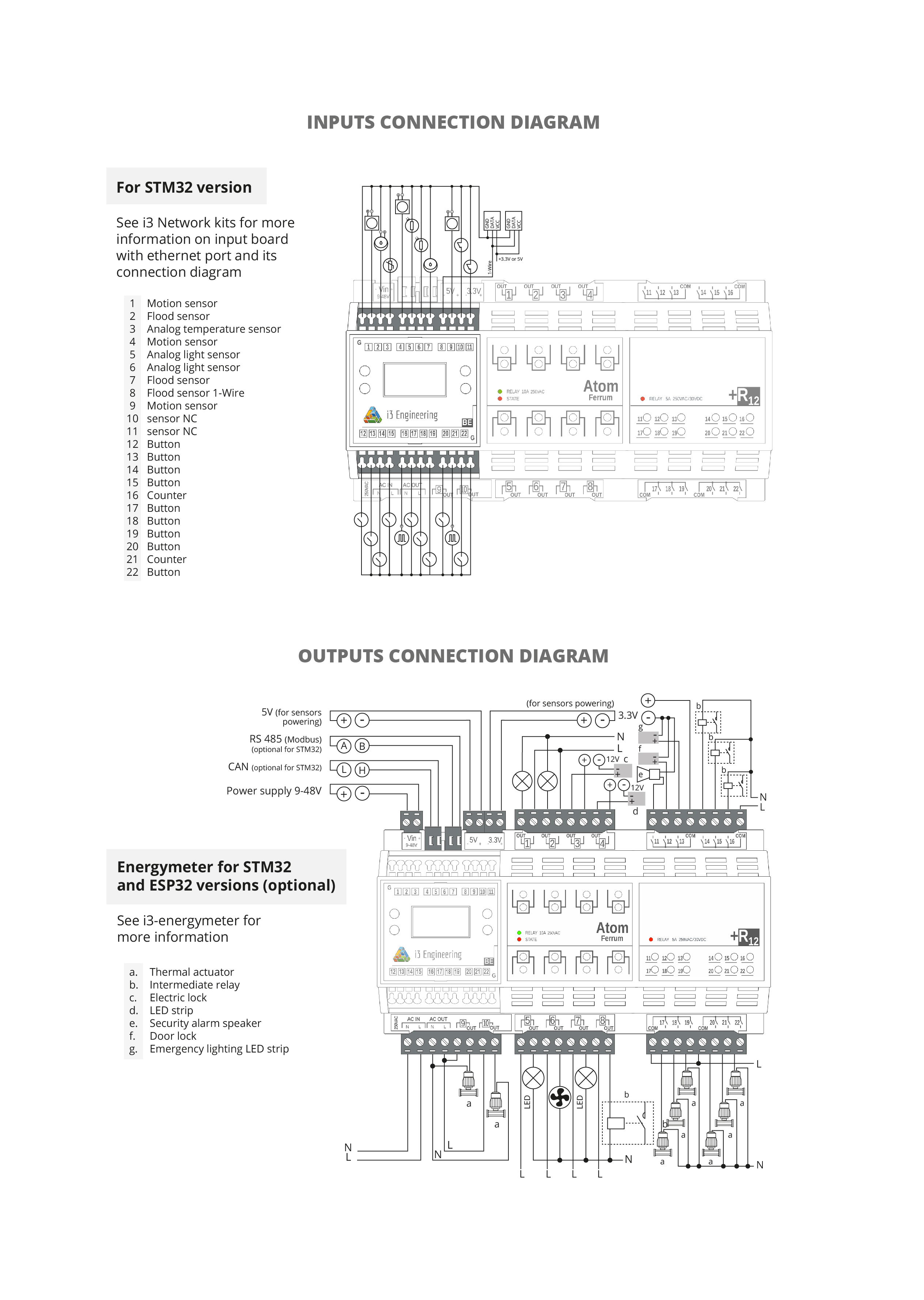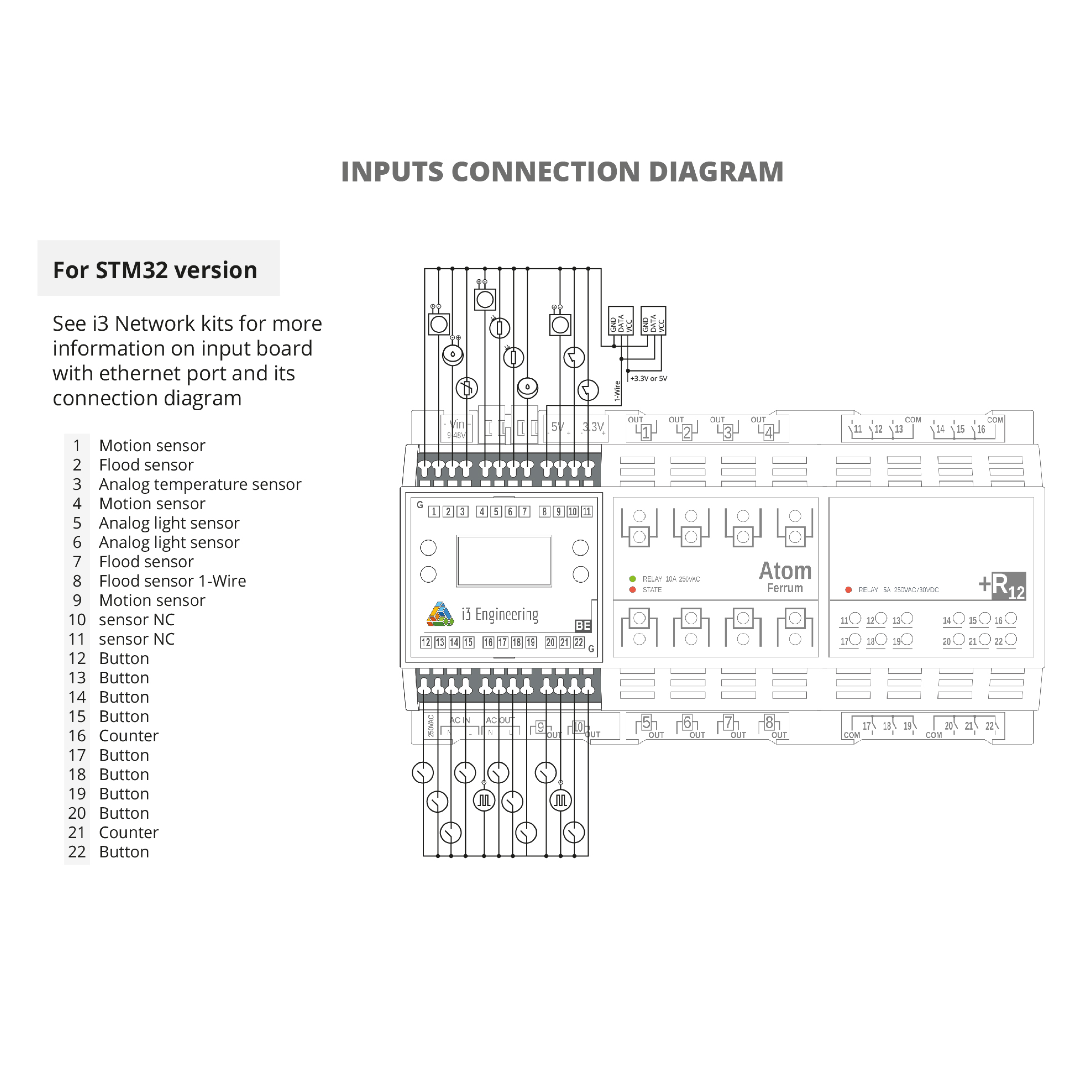 1-Wire, USART, I2C on IN1-IN2, IN7-IN8 for ESP32; on IN1-IN12 for STM32